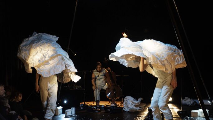 Papier froissé, cordes frottées, la violoncelliste et les deux comédien·nes nous invitent dans cet univers à la fois simple et virevoltant, où l’humour tutoie la poésie tant visuelle que sonore.