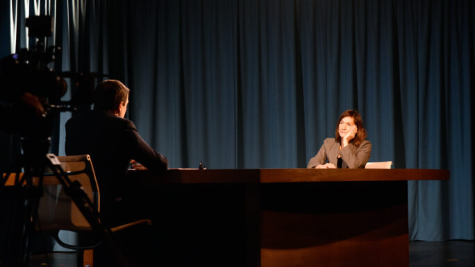 Assis·es à la place d’un François Mitterrand et d’une Ségolène Royal, d’une Marine Le Pen et d’un Jacques Chirac se font face Emmanuelle Lafon et Laurent Poitrenaux, reprenant les phrases qui leurs sont soufflées à l’oreillette, dans un re-enactment brillant qui donne à voir la théâtralité du politique et à entendre l’esprit des époques.