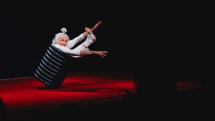 Le contorsionniste apprivoise Toyo, se glisse à l’intérieur et s’y installe, s’entortille et s’entremêle... L’objet devient une carapace, un costume, un chapeau, une tour d’équilibriste.